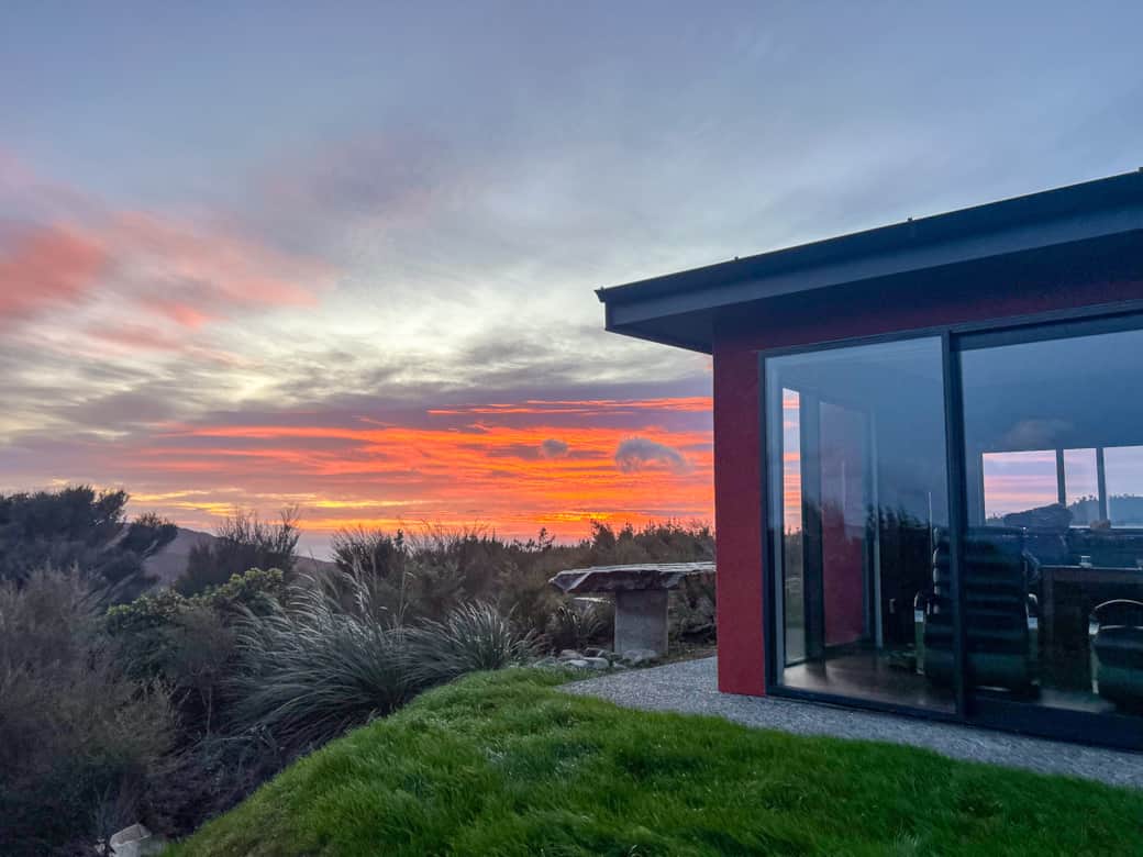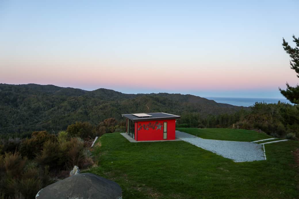 Perched at an elevation of 182 metres, this luxury hideaway offers 360° panoramic views that sweep across the ocean, mountains, and native bush.